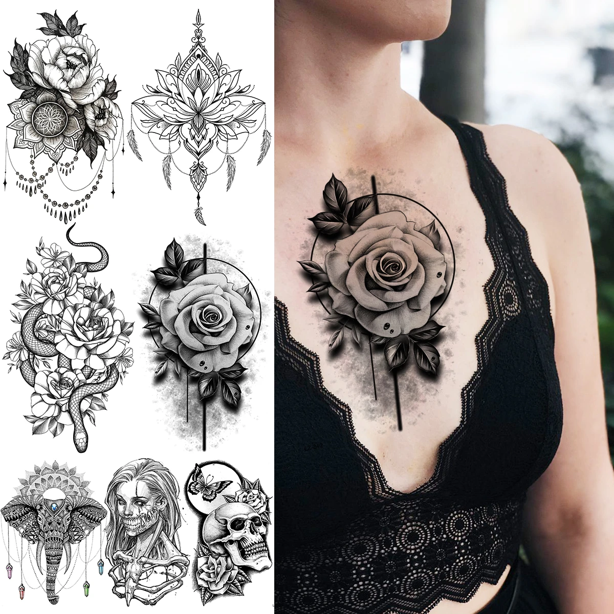 Rose Flower Temporary Tattoos For Women Girls Henna Snake Elephant Character Face Skull Fake Tattoo Sticker Chest Leg Tatoos 3d Temporary Tattoos Aliexpress